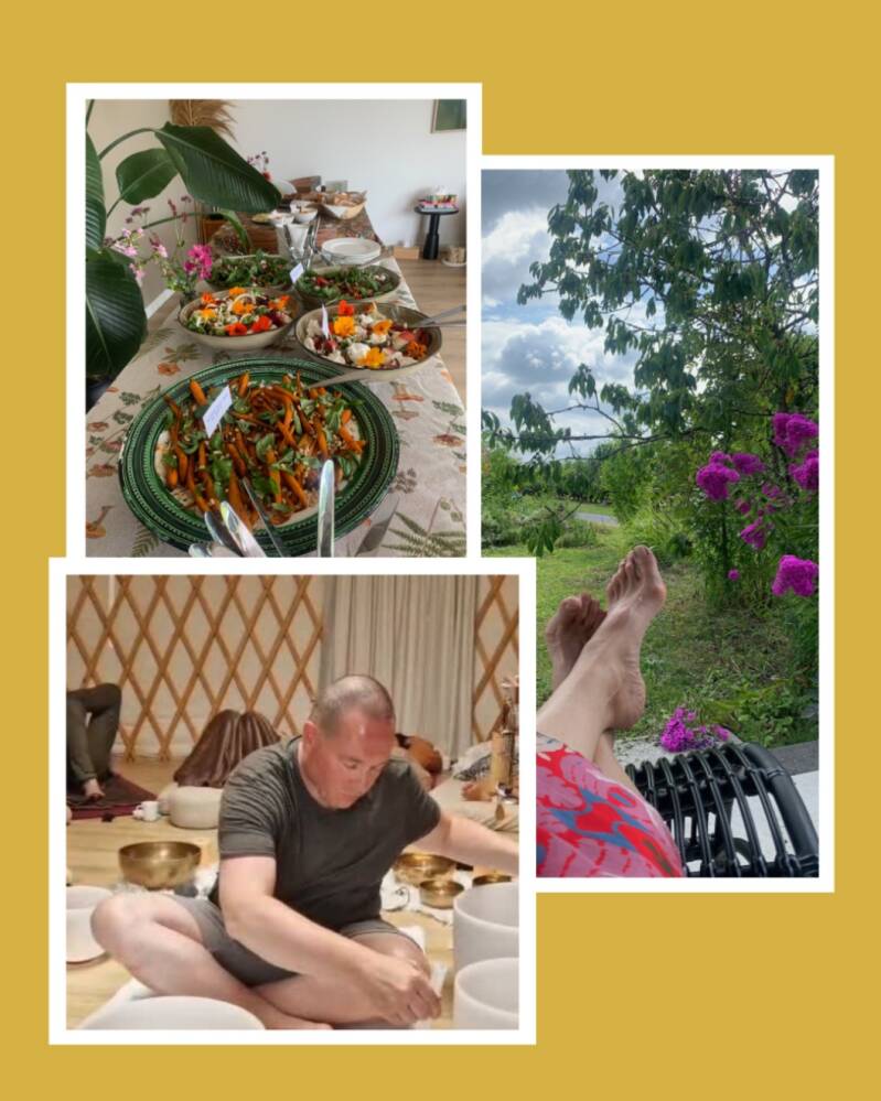 Je krijgt ruim de tijd om te verstillen, je kunt over het uitgebreide terrein van the Matter slenteren, binnen de yurt op een matrasje zitten of liggen of buiten in het gras, ervaren, zijn. Geen telefoon, geen onderling contact, gewoon in het hier en nu zijn.
